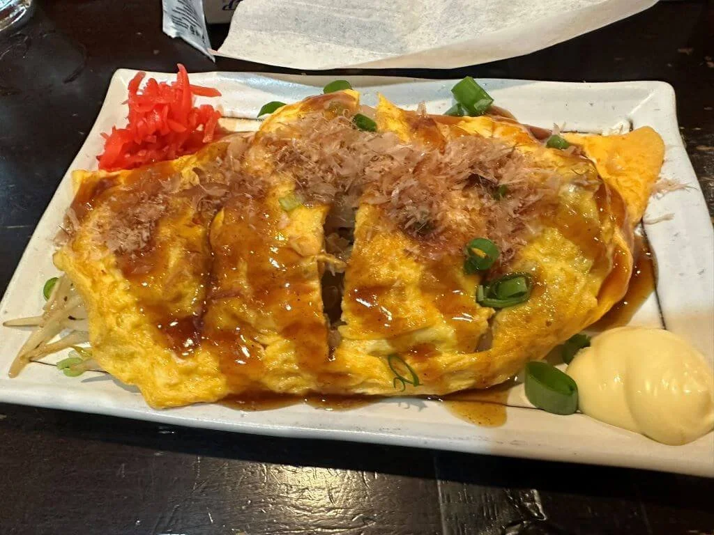 Instead of mixing all the ingredients into a batter, Tonpeiyaki layers stir-fried pork, cabbage, and green onions, then wraps them in a thin, soft omelette. It’s then finished with drizzles of okonomiyaki/tonkatsu-style sauce and Japanese Kewpie mayonnaise so you still get that sweet, savory, creamy hit typical of Osaka street food.