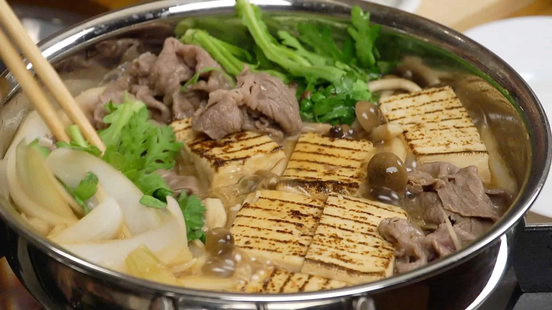It’s essentially a simmered dish of thinly sliced beef and tofu cooked together in a lightly sweetened soy-based dashi broth. The beef lends a rich umami flavor while the tofu absorbs the broth, creating a lovely contrast between the meatiness and the soft, silky texture of the tofu. The taste is warming and soothing, a little bit salty, and very juicy and fatty from the meat oils.