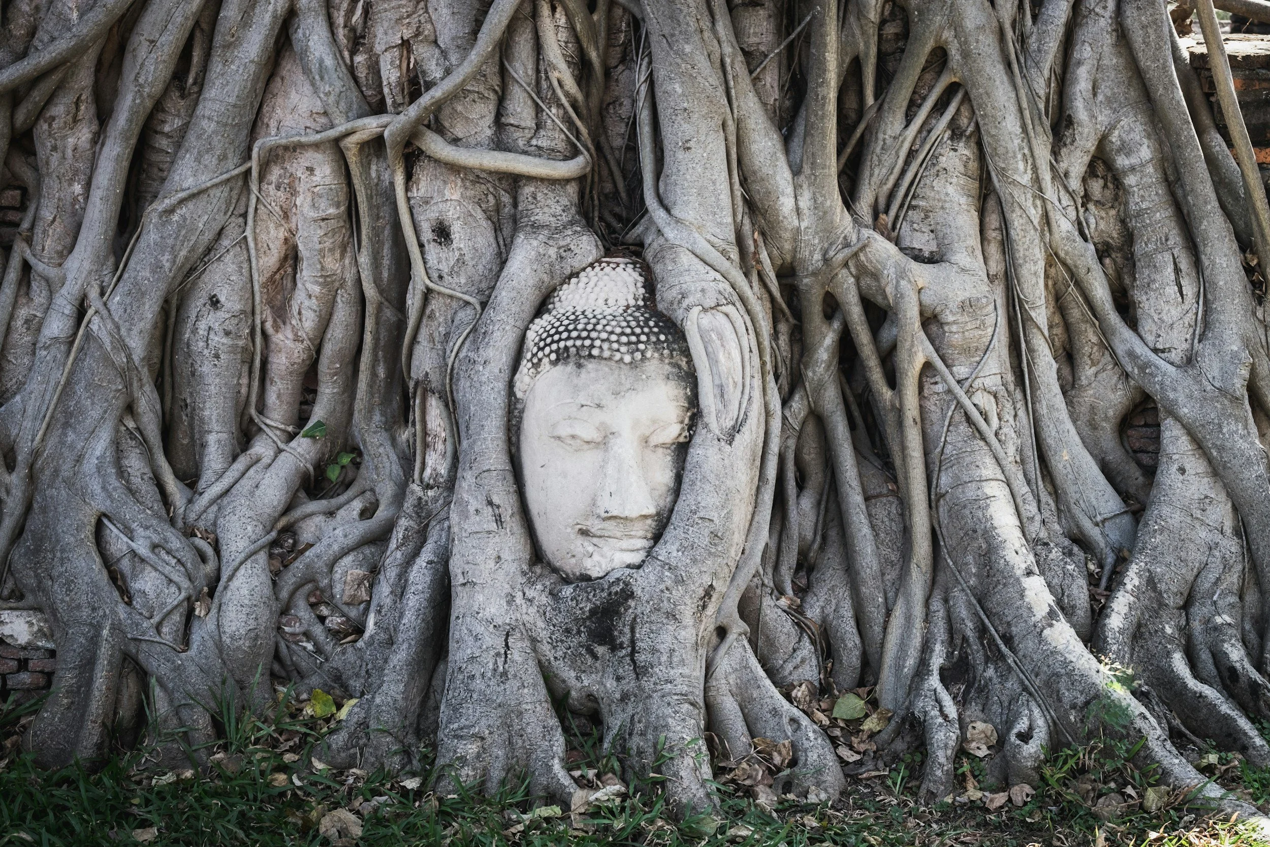The iconic head of the Buddha encased in tree roots at What Maha That
