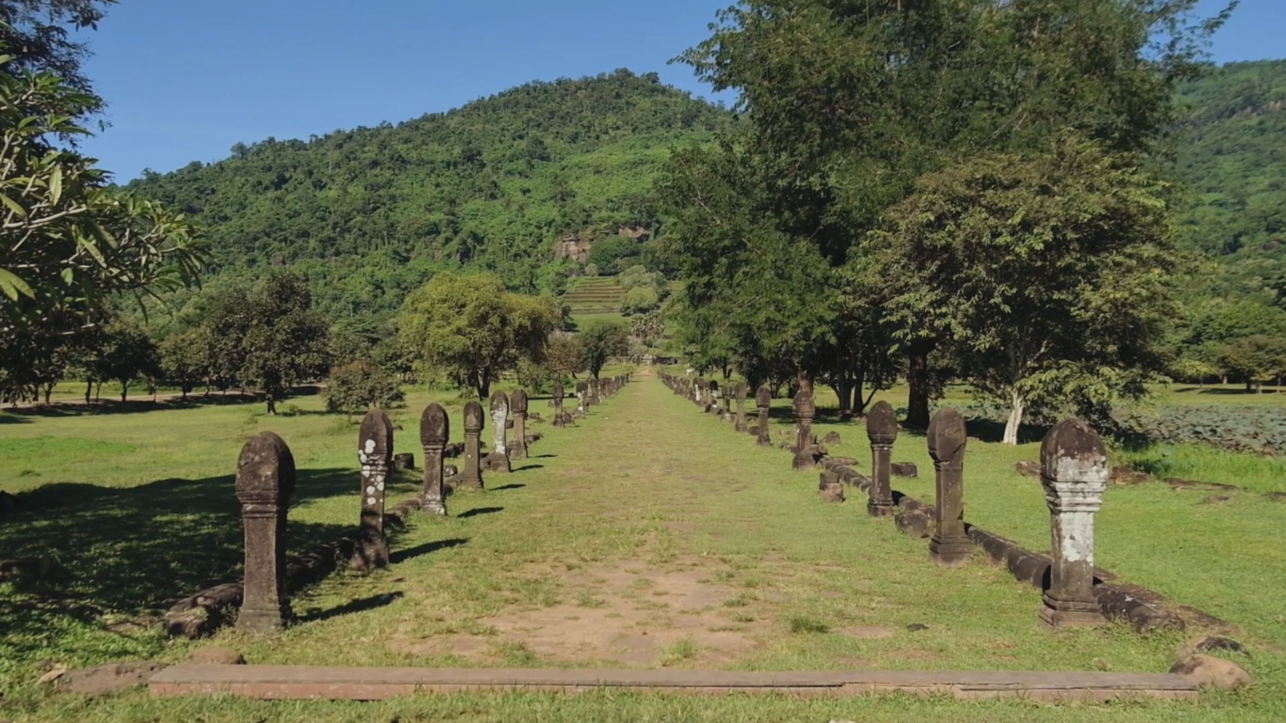 A long path leading to Vat Phou, which extends up the hill