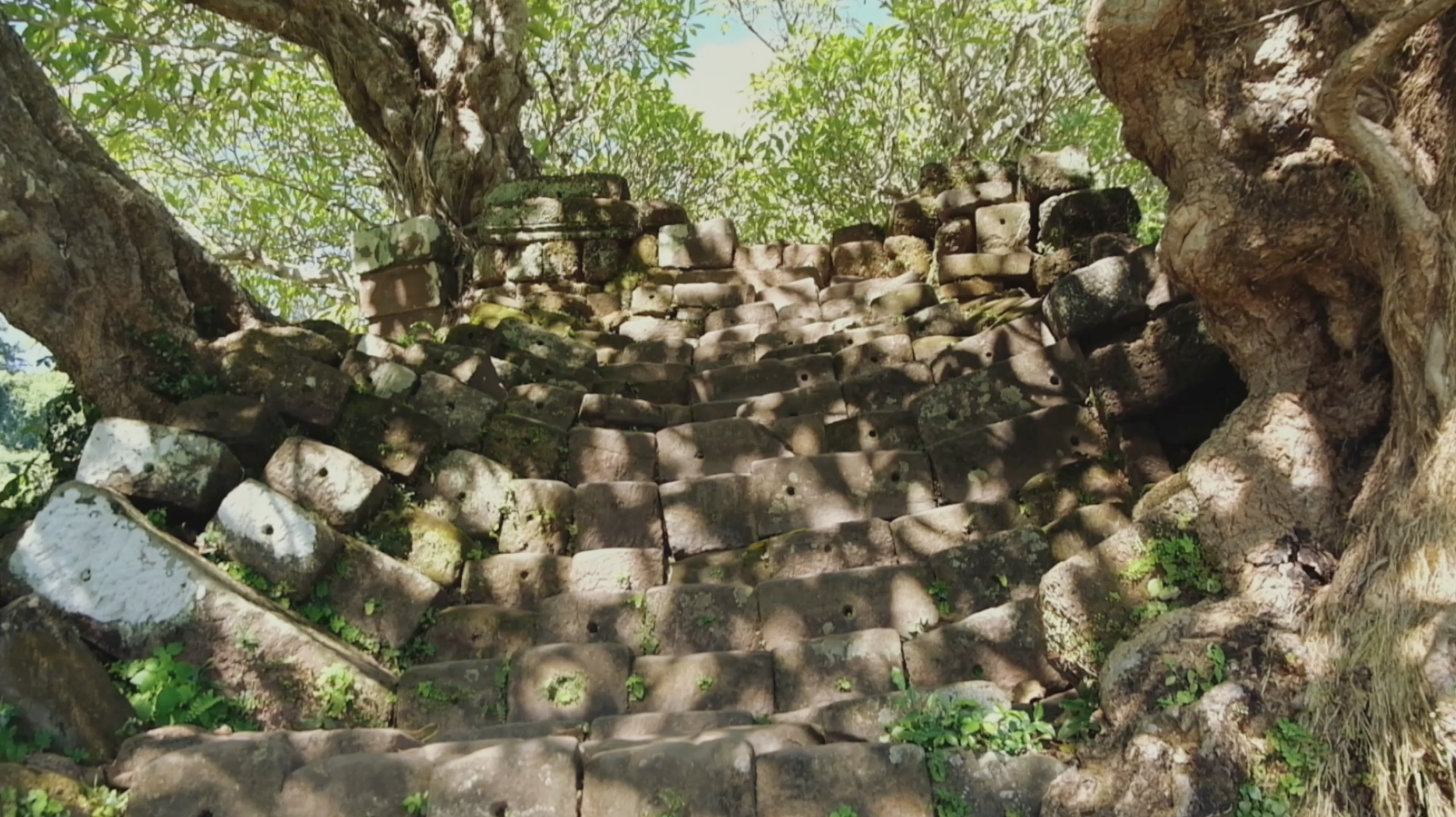 The stone stairs of Vat Phou were no doubt manipulated over time by natural weathering or shifting of the ground or soil.